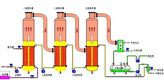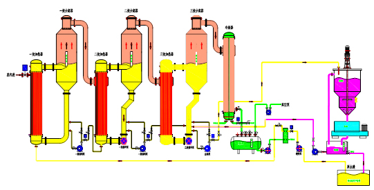 1、一效加熱器    2、二效加熱器    3、三效加熱器    4、一效分離器    5、二效分離器    6、三效分離器    7、預熱器    8、冷凝器    9、冷水罐
